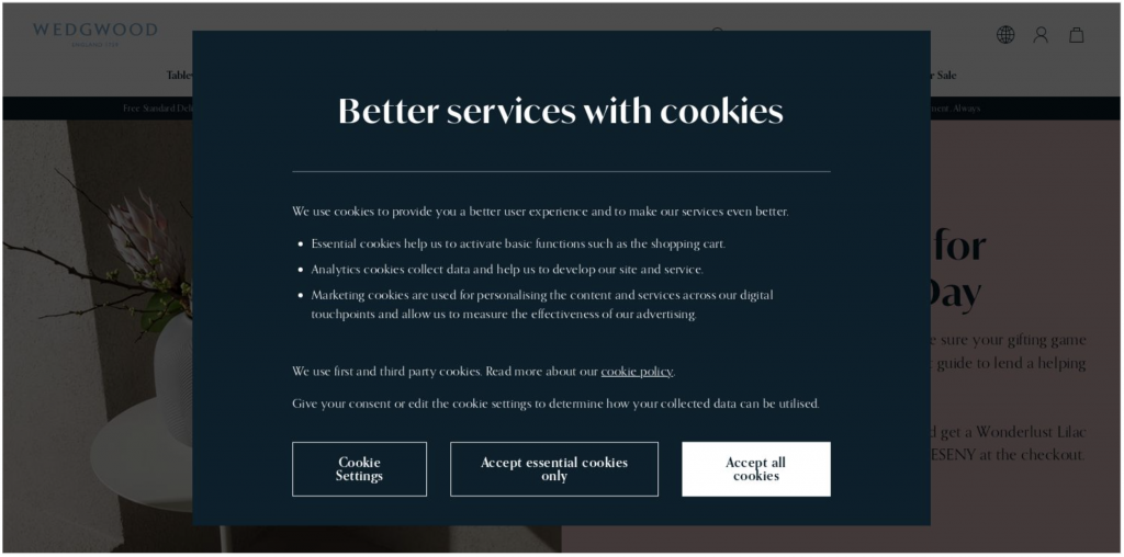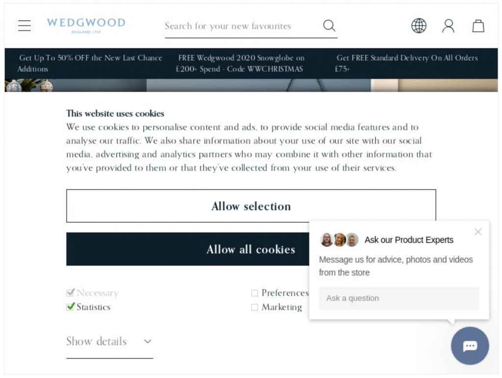 In these examples taken from October and November 2021, we see that Wedgwood 'rolled back' the CMP that didn't set many marketing cookies (as they were within the Marketing Category) if a user clicked the prominent Allow Selection button live in October 2021 to one where the cookies were set within the prominent Accept all cookies a month later.