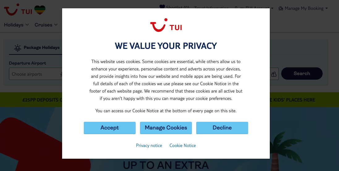 Similar to many of the more common implementations of consent messages, though here it doesn't show their brand — although those in the know will recognise their fonts and colour palette — and the user has to agree or customise.
