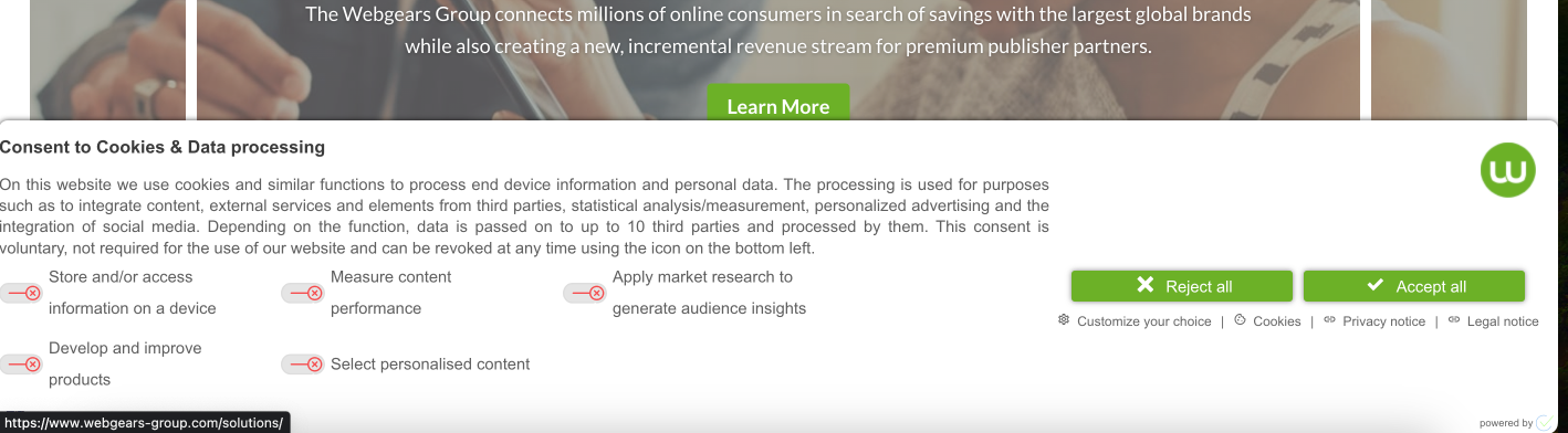 The most compliant example. The Consentmanager CMP does not allow preview to the site unless the CMP has been engaged. Interestingly, if the user clicks elsewhere on the page, a second tier banner appears. This presents two options for Reject all or Accept all, equally presented.